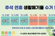 코리아타임뉴스 전남취재본부 | 순천시는 추석 연휴 기간 생활폐기물로 인한 시민 불편을 최소화하고, 쾌적한 도시 환경을 조성하기 위해 ‘추석 연휴 생활폐기물 수집․운반’을 안정적으로 추진한다. 추석 연휴 기간 동안 종량제 및 재활용, 음식물쓰레기 등 생활폐기물 수거는 10월 3일 금요일부터 10월 5일 일요일까지 정상적으로 이뤄지며, 추석 당일인 10월 6일 월요일과 10월 7일 화요일까지 이틀간은 수거하지 않는다. 10월 8일 수요일부터는 평상시와 같이 정상 수거한다. 또한 신속한 민원 대응을 위해 생활폐기물 수집·운반 대행업체와 합동으로 6개 반, 38명으로 구성된 ‘기동처리반’을 연휴 동안 운영해 주요 도로변 청소와 긴급한 민원을 처리할 예정이다. 한편, 오는 9월 30일 순천시 공직자와 24개 읍면동의 이·통장, 주민자치회, 자원봉사자 등 시민들이 함께 참여하여 4대 관문 및 공한지, 이면도로 등 청소 취약지역을 중심으로 추석 맞이 합동 대청소를 실시할 예정이다. 시 관계자는 “시민 불편 최소화를 위해 생활폐기물 처리에 만전을 기하겠다”며 “이웃과 함께 쾌적한 명절을 보낼 수 있도
