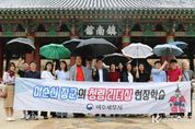 코리아타임뉴스 전남취재본부 | 여수세무서 청렴동아리 15명은 25일 오전 비가 내리는 가운데 진남관, 전라좌수영 동문터와 공사중인 동헌 등 전라좌수영성 주요 유적지를 답사하며 이순신의 청렴 리더십 현장체험학습 시간을 가졌다. 여수세무서 청렴리더십 현장학습 프로그램은 사단법인 여수여해재단과 공동으로 분기별로 여수시내 이충무공 유적지를 답사하며 이충무공의 청렴 리더십 강의와 함께 진행하고 있다. 이날 현장답사는 여수여해재단측에서 진남관 안내, 동문 및 전라좌수영 성터 답사에 이어 진남관유물전시관에서는 여수시 문화관광해설사로부터 진남관의 건축물이 지닌 역사에 대해서 상세한 안내를 받았다. 또한 여수세무서 청렴동아리 회원들은 진남관 입구에서 ‘공정하게’, ‘합리적으로’ 등의 구호가 적힌 손팻말을 들고 청렴하고 합리적이 세무행정 실천 캠페인도 펼쳤다. 전반기에는 통제이공대첩비와 충민사 답사를 마쳤으며, 하반기에는 이날 진남관 일대 답사에 이어 11월에 충무공 어머니 사셨던 곳과 선소 등 답사가 이어진다. 여수세무서 김훈 서장은 “세무 공직자로서 이순신 유적지를 답사하는 것은 이순신의 청렴 정신을