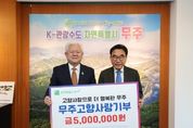 코리아타임뉴스 전북취재본부 | DH그룹(동해금속(주), 나봄리조트 등) 서동해 회장이 지난 24일 무주군에 고향사랑기부금 5백만 원을 기탁했다. 이날 서동해 회장은 "무주군은 나봄리조트를 통해 소중한 인연을 이어가고 있는 곳”이라며 “무주군과의 상생을 위해 앞으로도 세심한 관심을 쏟을 것”이라고 밝혔다. 전북 완주군에 본사를 둔 DH그룹은 주력 사업인 상용차 및 승용차 부품 생산 분야에서 ‘작지만 강한 기업’으로서의 입지를 확고히 하고 있으며 무주군 설천면에서는 나봄리조트를 운영하고 있다. 봉사 경영을 통한 사회 환원에도 적극적인 것으로도 알려진 DH그룹은 2008년에 설립된 '권정순 장학재단'을 통해 저소득층 지원, 청소년 장학사업, 소외된 이웃돕기 등 사회공헌 활동에 연간 3억여 원을 투입하고 있다. 무주군에는 2023년부터 3년간 총 1천1백만 원의 고향사랑기부금을 기탁해 훈훈함을 전하고 있다.
