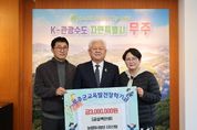 코리아타임뉴스 전북취재본부 | 농업회사법인 (유)신화가 지난 19일 (재)무주군교육발전장학재단에 장학금 3백만 원을 기탁했다. 신화는 2022년부터 매년 장학금(3백만 원)을 기탁하며 지역인재 육성에 필요한 동력이 되고 있다. 팽주봉 대표는 “지역사회와 걸음을 함께 하는 법인으로서 미력하나마 인재 육성에 힘을 보태고 있다는데 큰 보람을 느낀다”라며 “앞으로도 무주군 학생들이 더 나은 환경에서 공부하고 꿈을 키우며 무주를 이끄는 인재로 성장할 수 있도록 지속적인 관심을 기울일 것”이라고 밝혔다. 한편, 농업회사법인 (유)신화는 무주군 설천면에 위치해 있으며, 무주군으로부터 위탁을 받아 목재펠릿 공장을 운영하고 있다. 이곳에서는 무주 지역의 산림부산물과 목재 자원을 활용해 친환경 목재펠릿을 생산·공급하며, 무주군 친환경 에너지 산업과 산림 순환 경제 구축에 기여하고 있다.