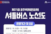 코리아타임뉴스 충남취재본부 | 공주시는 오는 10월 3일부터 12일까지 열리는 ‘제71회 백제문화제’ 기간 동안 관람객들의 원활한 이동을 돕기 위해 무료 셔틀버스를 운영한다고 밝혔다. 시는 축제 10일 중 휴일 9일 동안 45인승 셔틀버스를 투입해 강북과 강남을 연결하는 2개 순환 노선을 운행한다. 셔틀버스는 오후 1시부터 오후 9시까지 운영되며, 강남 노선은 1시간 간격, 강북 노선은 30분 간격으로 운행된다. 개·폐막식이 열리는 날은 오후 10시까지 연장 운행된다. 강북(신관) 노선은 금강신관공원을 출발해 대동다숲아파트, 국립공주대학교 북문, 대아주공4차아파트, 기적의도서관, 천년나무3단지, 흥화하브아파트, 현대3차아파트, 우남퍼스트힐, 주공5단지, 코아루아파트를 경유해 다시 금강신관공원으로 순환한다. 강남(신관) 노선은 금강신관공원에서 옥룡동어울림센터, 대웅맨션, 옥룡주공아파트, 영우마을, 공주교대, 공주고등학교, 중동초등학교, 중동사거리를 거쳐 공산성 방문자센터까지 연결된다. 특히 ‘웅진성 퍼레이드’와 ‘무령왕의 길’ 행사 기간에는 강남 노선이 우회 운영돼 금강신관공원에서 옥룡동