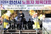 코리아타임뉴스 기동취재팀 | 안산시는 지난 15일 화랑유원지 마사토족구장에서 1,000여 명의 조합원과 가족들이 참여한 가운데 ‘제26회 안산시 노동자 체육대회’를 개최했다고 17일 밝혔다. 안산시 노동자 체육대회는 노동자들의 단합을 도모하고 노동존중 문화를 확산시키는 대표적인 지역 행사로, 노사정이 함께 참여하는 상생과 연대의 상징적 축제의 장으로 자리매김하고 있다. 이번 체육대회는 한국노총 안산지역지부(의장 방운제)가 주최·주관했으며, 노동자 간의 화합과 연대 강화, 가족이 함께하는 참여의 장으로 마련됐다. 이날 행사에서는 족구, 줄다리기, 단체줄넘기 등 조직력 강화 종목과 노동자 가족이 함께 즐길 수 있는 ‘슈팅복불복’, ‘풍선만들기’, ‘어린이 게임’ 등 가족 참여형 프로그램도 운영이 운영됐다. 특히, 다문화 체험 등 이주노동자를 위한 바자회가 함께 운영돼 ‘노동과 나눔이 함께하는 공동체 안산’의 의미를 더했다. 이민근 안산시장은 “노동자 여러분의 땀과 연대가 안산 발전의 밑거름”이라며 “앞으로도 노동이 존중받고, 일하는 모든 분이 행복한 도시를 만들기 위해 함께 노력해 나가겠다