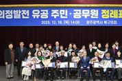 코리아타임뉴스 노승선 기자 | 광주 북구의회는 지난 18일, 지역사회 발전에 헌신한 유공자들의 노고를 기리기 위해 ‘2025년도 4분기 정례표창 수여식’을 개최했다. 이번 수여식은 투철한 봉사 정신으로 지역 발전과 주민 화합에 앞장선 구민 27명과 공무원 11명을 선정해 노고를 격려하고 감사의 마음을 전하고자 마련됐다. 행사는 색소포니스트의 식전 공연을 시작으로 국민의례, 표창패 수여, 축하 인사 및 기념촬영 순으로 진행됐다. 특히 이날 행사에서는 ‘어린이·청소년 모의의회 체험 수기 공모전’ 시상식도 함께 열려 의미를 더했다. 공모전에서 우수한 성적을 거둔 곡성중앙초등학교와 지산중학교 학생 7명에게 최우수상(3명), 우수상(2명), 장려상(2명) 상장이 수여됐다. 최무송 의장은 “항상 지역 곳곳에서 묵묵히 봉사하며 살기 좋은 북구를 만들기 위해 애써주신 수상자분들께 깊이 감사드린다”며 “북구의회도 수상자 여러분들의 땀과 헌신에 보답할 수 있도록 구민을 위한 의정활동에 최선을 다하겠다“고 전했다.