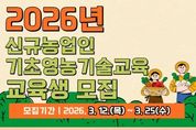 코리아타임뉴스 윤광희 기자 | 천안시농업기술센터는 오는 25일까지 ‘상반기 신규농업인 기초영농기술교육’ 참여자를 모집한다고 13일 밝혔다. 교육은 천안시로 이주한 지 5년 이내인 신규농업인과 귀농을 희망하는 시민으로, 모집인원은 30명이다. 교육은 내달 3일부터 6월 5일까지 10회에 걸쳐 귀농·귀촌 이해, 주요 작물 기술교육, 관련 법률 및 현장교육 등이 진행될 예정이다. 교육 신청은 천안시농업기술센터에 방문접수하거나 천안시통합예약시스템을 통해 온라인으로도 가능하다. 김양섭 천안농업기술센터 소장은 “이번 교육을 통해 농촌사회에 안정적으로 정착할 수 있길 바란다”며 “귀농 활성화를 위해 다양한 교육을 지속적으로 추진할 것”이라고 말했다.