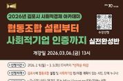 코리아타임뉴스 기동취재팀 | 김포시가 사회문제 해결을 위한 참신한 아이디어와 실행력을 갖춘 사회적경제기업 육성을 위해 ‘2026년 김포시 사회적경제 아카데미’를 개설하고, 오는 3월 3일까지 수강생을 모집한다. 이번 아카데미는 평소 사회적경제에 관심 있는 김포시민은 물론, 연내 협동조합 설립과 사회적기업 인증을 준비 중인 관내 기업, 단체라면 누구나 신청할 수 있다. 교육 과정은 ▲사회적기업 개념 및 인·지정 요건 ▲협동조합 개념, 설립 절차 및 인가 요건 ▲2026년 지원제도 등 사회적경제에 대한 기본 개념을 습득하고, 연내 진입을 위한 사전 준비가 가능하도록 실전형으로 구성했다. 특히 전문가 1:1 멘토링을 통해 ▲사업 아이템의 경쟁력 및 지속가능성 진단 ▲정관, 사업계획서 등 필수서류 작성 ▲심사 및 현장실사 대비 전략 등 기업 맞춤형 컨설팅이 후속으로 지원될 예정이다. 수강신청은 3월 3일까지 온라인으로 가능하며, 자세한 사항은 김포시청 홈페이지를 참조하거나 김포시청 지역경제과로 문의하면 된다. 김포시는 ‘일자리창출을 위한 재정지원’을 비롯해 ‘전략모델 개발비’, ‘교육·컨설팅’