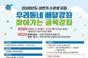 코리아타임뉴스 부산취재본부 | 기장군은 오는 2월 9일부터 12일까지 ‘상반기 우리동네 배달강좌 및 찾아가는 골목강좌’ 수강생을 모집한다고 6일 밝혔다. ‘우리동네 배달강좌’란 학습자가 원하는 시간과 장소에 강좌를 배달하는 평생학습 프로그램이며 ‘찾아가는 골목강좌’는 우리동네 배달강좌의 일환으로, 소외계층을 대상으로 운영되는 평생학습 프로그램이다. 이번 강좌는 ▲교육·학문 ▲어학 ▲건강 ▲음악 ▲미술·공예 ▲컴퓨터·통신 ▲가정·생활 분야 총 60강좌를 모집한다. 수업은 3월 23일부터 5월 29일까지 10주간 운영되며, 대면 수업과 함께 ZOOM 등 온라인 플랫폼을 활용한 비대면 수업을 병행해 학습 편의성과 접근성을 높일 예정이다. 신청대상은 19세 이상 기장군민으로, 대면 강좌는 10인 이상, 비대면 강좌는 7인 이상 학습자를 구성하여 강좌를 신청할 수 있다. 골목강좌는 7인 이상의 학습소외계층(▲기초생활수급자 ▲차상위계층 ▲장애인 ▲다문화·한부모·다자녀가정 ▲남성수강생 ▲직장인)으로만 구성되어야 신청이 가능하다. 신청방법은 기장군 평생학습 홈페이지에서 강사현황을 참고하여 배달강사를 선택한 후 수