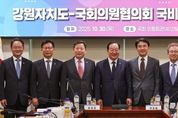 코리아타임뉴스 김택호 기자 | 김진태 강원특별자치도지사는 10월 30일 오후 2시, 국회 의원회관에서 도내 지역구 국회의원 7명과 함께 도 국회의원협의회를 열고 2026년도 국비 추가 확보 방안 등을 논의했다. 이번 간담회는 2026년도 정부예산안의 국회 심의가 본격화되는 시점에 맞춰 도와 지역 국회의원 간 협력체계를 강화하기 위해 마련된 자리로, 김 지사를 비롯해 지역구 국회의원 보좌진이 참석해 예산 확보 전략을 중심으로 실무적인 논의를 진행했다. 이 자리에서 도는 올해 국비 10조 원 시대를 처음으로 연 성과를 바탕으로 정부 예산안에 미반영된 24개 사업(총 612억 원)의 국비 추가 확보 방안을 논의하고, 해당 사업들이 국회 심의 과정에서 반드시 반영될 수 있도록 국회의 적극적인 협력을 요청했다. 이와 함께 ▲용문~홍천 광역철도 예타 통과 ▲삼척~강릉 고속화철도 예타 통과 ▲포천~철원 고속도로 예타 통과 ▲소양8교 건설 국비 반영 ▲제5차 국가철도망 구축계획 및 제6차 국도‧국지도 건설계획 최대 반영 등 강원지역 주요 에스오시(SOC) 현안과제에 대해서도 폭넓은 논의가 이뤄졌다. 한기호 국회의