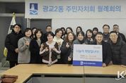 코리아타임뉴스 사회팀 | 수원시 영통구 광교2동은 지난 5일, 광교2동 주민자치회가 이웃돕기 성금 100만원을 광교2동 행정복지센터에 전달했다고 밝혔다. 광교2동 주민자치회는 평소 이웃돕기 활동을 비롯해 지역사회 나눔 문화 확산과 주민 복지 증진을 위한 다양한 활동을 지속적으로 추진해 오고 있으며 이번 성금은 설 명절을 맞아 어려운 이웃이 소외되지 않도록 주민자치회 회원들의 자발적인 참여로 마련됐다. 김병직 광교2동 주민자치회장은 “설 명절을 맞아 주변의 어려운 이웃을 위해 뜻을 모아준 주민자치회원들께 감사드린다”며 “앞으로도 지역사회의 어려운 이웃을 위한 나눔 활동을 꾸준히 이어가겠다”고 밝혔다. 이날 전달된 성금은 광교2동 행정복지센터를 통해 관내 취약계층 및 위기가구 지원에 사용될 예정이다.