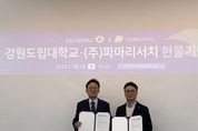 코리아타임뉴스 이아름 기자 | 강원도립대학교와 재생의학 기반 바이오 제약 기업인 ㈜파마리서치(대표이사 손지훈)가 지역 혁신 성장을 주도할 전문 인재 양성을 위해 손을 잡았다. 강원도립대학교는 2월 4일 대학 본부에서 파마리서치와 ‘산학협력 업무협약 및 현물 기탁식’을 개최했다고 밝혔다. 이번 행사는 양 기관이 앞서 서면으로 체결한 산학협력 협약의 내용을 공유하고, 파마리서치 측에서 기탁한 현물을 전달하기 위해 마련됐다. 양 기관은 이번 협약을 통해 대학과 기업이 보유한 역량을 결합해 지역 맞춤형 인재 양성을 위한 현장 밀착형 교육 생태계를 구축하기로 뜻을 모았으며, 영동지역 청년 인재 채용 활성화 및 실무형 전문 인력 양성, 객관적 취업 정보 공유, 산학 공동발전을 위한 구체적인 협력 사업을 함께 펼칠 예정이다. 특히 파마리서치는 이번 MOU 체결을 기념해 학생과 교직원에게 1천만원 상당의 자사 대표 제품을 기탁하며 학생들의 건강한 도전과 성장을 응원했다. 강원도립대학교 최종균 총장은 “글로벌 바이오 기업인 파마리서치의 소중한 기탁과 협력 약속에 깊은 감사를 드린다”며 “대학 또한 기