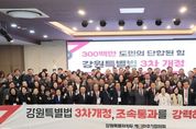 코리아타임뉴스 이아름 기자 | 강원특별자치도 범국민추진협의회(협의회장 최양희, 추진단장 김천수)가 11월 21일 11시, 춘천 스카이컨벤션 2층 컨벤션홀에서 강원특별법 3차개정 조속 통과 촉구 결의대회를 개최했다. 당초 정기총회를 개최할 예정이었으나 어제(11월 20일) 국회 행정안전위원회 법안소위에서 강원특별법 3차 개정이 논의가 불발되자 긴급 행동에 나섰다. 이날 결의대회에는 범추협 위원들을 비롯해 고문직을 맡고 있는 김진태 도지사, 김시성 도의회 의장 등 200여 명이 참석하여 조속 통과를 촉구하는 목소리를 높였다. 최양희 협의회장은 “오늘은 강원특별자치도의 성과를 함께 축하하는 날이 돼야 했지만, 어제 행안위에서 3차 개정을 또 미루는 바람에 오히려 우리의 결의를 더 크게 보여줘야 하는 날이 됐다”라며, “각 지역에서 올라오신 위원 여러분의 지혜와 네트워크가 어느 때보다 절실하다”라고 말했다. 김진태 강원특별자치도지사는 “3차 개정안이 처음 국회에 올라간 게 작년 9월인데, 1년이 넘도록 단 한 번도 심사를 하지 않았다”라며, “5극 3특을 강조하면서 특별자치도 법은 시간이 없다고 국회 심사가 미뤄