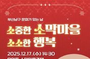 코리아타임뉴스 부산취재본부 | 부산 남구는 오는 12월 17일 오후 2시 30분, 우암동 소막마을 주택에서 2025 남구 문화가 있는 날 '소중한 소막마을, 소소한 행복' 공연을 개최한다고 밝혔다. 이번 공연은 역사적 의미가 담긴 소막마을 주택을 지역 문화공간으로 활용하여, 주민들이 일상에서 자연스럽게 문화예술을 접할 수 있도록 마련됐다. 무대는 마술 풍선쇼, 합창, 퓨전국악, 트로트 등 다양한 장르로 구성되어 남녀노소 누구나 부담 없이 즐길 수 있는 무대로 꾸며진다. 특히 소막마을 주택의 아늑한 분위기가 더해져 ‘작지만 소중한 행복’을 나누는 따뜻한 연말 공연이 될 것으로 기대된다. 오은택 남구청장은 “일상 가까이에서 이웃과 함께 문화를 즐기는 경험은 지역 공동체의 정서 교류에 큰 의미가 있다”며 “많은 분이 오셔서 따뜻한 무대와 즐거운 공연을 함께하시길 바란다”고 전했다.