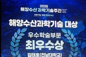 코리아타임뉴스 사회팀 | 전남대학교 김태호 교수(해양생산관리학과)가 해양수산부가 주최하고 해양수산과학기술진흥원이 주관한 ‘2025 해양수산과학기술대상’에서 우수학술부문 최우수상을 수상했다. 시상식은 12월 2일 서울 양재동 aT센터에서 열린 2025 해양수산과학기술주간 행사에서 진행됐다. 7일 전남대에 따르면, 김 교수는 해양수산부의 수산전문인력양성사업(스마트수산양식연구센터)의 지원을 바탕으로 다기능성 키토산 하이드로겔 기반 양식장 수질정화 기술 개발을 개발해 암모니아성 질소(TAN) 및 아질산(NO₂) 제거 효율을 획기적으로 향상시키는 성과를 거두며 높은 평가를 받았다. 해당 하이드로겔은 20회 이상 재사용 가능한 친환경 소재로, 기존 응집제 대비 처리 속도 및 운영비 절감 효과가 뛰어난 기술이다. 또한 스마트 RAS(순환여과식 양식 시스템) 운영과 연계돼 AI 기반 수질 예측–저환수–탄소저감 운영까지 확장 가능한 차세대 수처리 플랫폼 기술로 평가받고 있다. 김 교수는 이 기술을 기반으로 SCIE 논문 5편 (mrn IF 평균 90.06), 특허 등록 5건, 기술이전 5건, 석·박사급 전문 인력