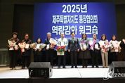 코리아타임뉴스 노승선 기자 | 지역 현장의 최일선에서 주민과 행정을 연결하는 핵심 역할을 수행하는 제주특별자치도 통장협의회가 6일 지역 발전과 상호 교류를 확대하기 위한 소통의 자리를 마련했다. 이번 출범식은 올해 8월 1일 출범한 제주도 통장협의회의 첫 공식 행사다. 제주특별자치도는 이날 오전 제주국제컨벤션센터에서 도내 31개 동 지역 통장 600여 명이 참석한 가운데 ‘2025년 제주특별자치도 통장협의회 역량강화 워크숍’이 개최됐다고 밝혔다. 이번 워크숍에서는 올해 지역발전을 위해 기여한 우수 통장 31명이 장관, 도지사, 도의회의장 표창 및 도교육감 감사패를 받았다. 특히 김도연 회장은 올해 도 단위 통장협의회 출범을 이끈 공로를 인정받아 행정안전부장관 표창을 수상했다. 이후 특강에서는 국제웃음치료협회 한광일 회장이 ‘즐거운 소통 리더십’을 주제로 통장의 역할과 임무를 유쾌하게 풀어내며 참석자들의 큰 호응을 얻었다. 김도연 회장은 인사말을 통해 “2025년 도 통장협의회가 결성된 만큼 앞으로 도내 통장들이 하나로 연대해 주민과 함께 도정 정책 실행에 적극 동참하겠다”는