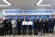 코리아타임뉴스 사회팀 | 울산광역시교육청과 인천광역시교육청이 4일 오후 4시 울산교육청 접견실에서 교육·연구 분야 교류 활성화를 내용으로 하는 업무협약을 했다. 이번 협약은 두 교육청이 상호 신뢰와 협력을 바탕으로 독서·인문교육과 연구 분야 발전을 도모하고, 지역 문제 해결과 사회 공헌을 위한 공동 프로그램 개발을 함께 추진하고자 마련됐다. 두 교육청은 이번 협약으로 교육·연구 분야 교류 활성화를 위한 다양한 프로그램을 공동 운영하고, 상호 연계로 교육 발전을 꾀한다는 방침이다. 또한 지역사회의 문제해결과 공공 가치를 실현하는 사회 공헌 프로그램을 공동 개발하고 운영하는 데 협력하기로 했다. 특히, 울산광역시교육청의 대표 독서인문교육 프로그램 ‘책크인’ 과 인천광역시교육청의 대표 독서교육 프로그램 ‘읽걷쓰’를 연계해 두 기관의 우수 교육 자료(콘텐츠)를 상호 공유하고 발전시킬 계획이다. ‘책크인’은 ‘책으로 크는 우리 아이’와 ‘독서의 세계로 체크인(check-in)한다’는 의미를 담아 학생의 성장과 독서 문화 확산을 목표로 한다. ‘읽걷쓰’는 읽기(문해력), 걷기(기초체력