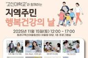 코리아타임뉴스 부산취재본부 | 부산 동래구는 오는 11월 15일 낮 12시부터 동래구 혁신어울림센터(동래구 금강로 129) 1층 어울림 마당에서 고신대학교와 함께 ‘지역 주민 행복 건강의 날’ 행사를 개최한다고 밝혔다. 이번 행사는 지역 주민의 건강 증진과 삶의 질 향상을 위해 마련된 것으로, 어린이부터 성인까지 전 연령층이 참여할 수 있다. 혁신어울림센터 행사장 내 각 부스는 체험 내용과 참여 인원에 따라 운영시간이 상이하며, 모든 프로그램은 현장에서 선착순 접수로 참여할 수 있다. 행사에는 고신대학교의 복음병원과 웰니스센터가 참여해 전문적인 건강 체험과 상담 프로그램을 진행한다. 주요 프로그램으로는 △신체 재활 건강 체험(인지 재활치료, 손 기능 평가) △언어·목소리·기억력 검사 △영양판정 및 상담 △기본 건강진단 △탄력밴드 운동 및 테이핑 요법 체험 △어린이 청진기 만들기 체험 등이 운영될 예정이다. 동래구 관계자는“이번 행사는 주민들이 쉽고 즐겁게 건강을 점검하고, 일상 속 건강관리 습관을 기르는 데 도움을 드리기 위해 준비했다”라며 “고신대학교와의 협력을 통해 전문성과 신뢰도를