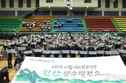 코리아타임뉴스 전북취재본부 | 진안군이 26일 오후 진안문예체육회관에서 군민 500여 명과 주요 내빈이 참석한 가운데 ‘진안양수발전소 유치 성공기원 범군민 결의대회’를 성황리에 마무리하고, 유치 성공에 대한 강력한 의지를 대내외에 선포했다. 이날 결의대회에는 전춘성 진안군수를 비롯해 김관영 전북특별자치도지사, 안호영 국회의원, 동창옥 진안군의회 의장, 그리고 한국동서발전 권명호 사장 등이 참석하여 진안의 도약에 힘을 실었다. 먼저 성공기원공연으로 준비된 붓글씨 공연(캘리그라피)에서는 ‘새로운 시작, 100년 미래 진안양수발전소’라는 문구를 역동적인 붓놀림으로 그리며 진안의 강력한 의지를 예술적으로 승화시켜 참석자들의 큰 박수를 받았다. 이어 진행된 구동수 위원장과 신갑수 위원장의 결의문 낭독 직후 두 위원장의 선창에 맞춰 500여 군민이 하나 된 목소리로 일제히 손 피켓 펼치기 퍼포먼스가 진행돼 군민의 하나 된 힘으로 양수발전소를 진안에 유치하겠다는 결의를 다졌다. 특히, 마지막 유치 성공 다짐 퍼포먼스는 참석자들의 마음을 하나로 모았다. 군민과 주요 내빈들이 행사 시작 전 대형애드벌룬