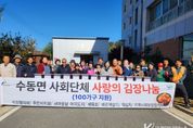 코리아타임뉴스 경기취재본부 | 남양주시는 10일 수동면에서 7개 사회단체가 함께 취약계층을 위한 ‘사랑의 김장 나눔’ 행사를 진행했다고 밝혔다. 이번 행사는 경기도농수산진흥원이 주관한 ‘경기농식품 나눔문화 확산사업’ 공모에 수동면 주민자치회가 선정돼, 농산물 소비 촉진 및 취약계층 대상 지역공동체의 나눔 문화 확산을 위해 마련됐다. 행사에는 수동면 이장협의회, 주민자치회, 새마을남녀지도자, 체육회, 바르게살기위원회, 적십자회, 지역사회보장협의체 등 7개 단체, 80여 명이 힘을 모아 김치를 정성껏 담갔다. 이날 마련된 김치 100통은 수동면 관내 독거노인, 장애인, 복지사각지대에 놓인 저소득층 가정 등에 전달됐다. 특히 각 사회단체별로 회원들이 김장 김치를 직접 전달하며 이웃의 안부를 살폈다. 이진춘 수동면장은 “경기도의 지원과 지역 7개 단체의 협력이 더해져 이웃에게 따뜻한 마음을 전할 수 있었다”며 “앞으로도 정성과 마음을 담은 나눔이 계속될 수 있도록 적극 지원하겠다”고 말했다. 수동면은 앞으로도 이웃과 함께하는 따뜻한 나눔과 돌봄이 일상 속에 스며들 수 있도록 지속적인 노력을 이