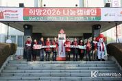 코리아타임뉴스 기동취재팀 | 지난 12일 여주시와 경기 사회복지공동모금회는 연말연시 나눔문화 확산을 위한'희망2026 나눔캠페인'의 시작을 알리는 사랑의 온도탑 제막식을 개최했다. 이번 캠페인의 슬로건은 “행복을 더하는 기부, 기부로 바꾸는 여주”로 이충우 여주시장, 박두형 여주시의회 의장 및 시의원, 김효진 경기 사회복지공동모금회 사무처장 등 10여명이 참석하여 제막식과 슬로건 피켓팅을 통해 홍보활동을 진행했다. '희망2026 나눔캠페인'은 2025년 12월 1일부터 2026년 1월 31일까지 62일간 여주시 지정기탁 모금액 4억원을 목표로 각 읍면동 및 본청에서 모금을 접수하며, 목표액의 1퍼센트인 4백만원의 성금이 모금될 때마다 사랑의 온도탑의 온도가 1℃씩 올라간다. 집중모금기간동안 모금된 성금 등은 사회복지공동모금회를 통해 여주시 지정기탁금 계좌로 적립되어 관내 취약계층 및 사회복지시설 등을 위한 복지사업의 재원으로 소중히 사용될 예정이며, 많은 시민들의 관심과 참여를 촉구하는 뜻깊은 자리였다.