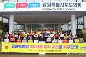 코리아타임뉴스 김택호 기자 | 강원특별자치도의회는 25일 오후 1시 30분 도의회 본관 앞에서 ‘강원특별법 3차 개정안’의 조속한 국회 심사를 촉구하는 결의대회를 열었다. 이번 결의대회는 개정안이 발의된 이후 국회에서 심사조차 제대로 이뤄지지 않고 있는 상황에 대한 도민들의 인내 한계와 지역 균형발전에 대한 요구가 높아진 데 따른 것이다. 강원특별법 3차 개정안은 지난해 9월 한기호 의원과 송기헌 의원이 공동 발의했으나 현재까지 단 한 차례도 행안위 법안심사소위가 개최되지 않는 등 심사 지연이 장기화되고 있는 것으로 알려졌다. 정기국회 종료가 임박한 상황에서 이번 회기 내 법안 처리를 위한 시급성도 부각되고 있다. 이날 결의대회에는 국회 앞에서 릴레이 1인 시위를 이어가고 있는 박윤미 부의장과 이한영 운영위원장을 제외한 전 도의원이 참석했다. 문관현 기획행정위원장이 낭독한 결의문에는 ▲ 강원특별법 3차 개정안의 즉각 처리 요구 ▲ 개정안이 통과될 때까지 끝까지 투쟁하겠다는 결의 ▲ 300만 강원도민의 생존권 수호하겠다는 의지가 담겼다. 도의회는 결의대회 직후 결의문을 국회에