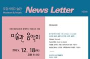 코리아타임뉴스 경북취재본부 | 포항시립미술관은 오는 18일 오전 11시, 제103회 미술관 음악회 ‘MUSEUM · MUSIC’를 개최한다. 이번 음악회는 2025년 마지막 음악회로, 크리스마스와 연말 분위기에 어울리는 다채로운 음악 프로그램을 마련해 시민들에게 따뜻한 문화 향유의 시간을 선사할 예정이다. 미술관 음악회는 2014년부터 ‘문화가 있는 날’과 연계해 정기적으로 운영되고 있는 포항시립미술관의 대표 문화 프로그램이다. 전시 감상과 공연을 결합한 복합 문화 향유 모델로 자리 잡았으며, 매월 다양한 장르의 음악을 선보여 시민들이 일상 속에서 예술을 가까이 접할 수 있도록 하고 지역 문화예술 활성화에도 꾸준히 기여해 왔다. 이번 제103회 음악회는 지역 기반 생활예술단체와 시민 예술인이 함께하는 공연으로 기획됐다. 클래식 기타 앙상블 ‘폴인클래타(Fall in Clatta)’를 중심으로 혼성 포크기타 듀오 ‘로얄젤리’, 하모니카와 팬플룻 협연, 싱어송라이터 공연까지 어우러진 다(多)장르 구성으로 세대와 취향을 아우르는 무대를 선보인다. 공연의 문을 여는 폴인클래타 앙