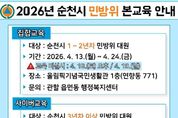 코리아타임뉴스 전남취재본부 | 순천시는 오는 13일부터 관내 민방위 대원의 비상사태 및 재난 발생 시 대응 역량 강화를 위해 ‘2026년 민방위 본교육’을 실시한다고 밝혔다. 이번 민방위 교육은 20세부터 40세(1986년생~2006년생)까지의 민방위로 편성된 15,064명을 대상으로 집합교육과 사이버교육으로 진행된다. 집합교육은 1~2년차 대원을 대상으로 4월 13일부터 24일까지 올림픽기념국민생활관(1층)에서 일 2회 진행되며, 전문 민방위 강사들이 ▲민방위 대원의 임무와 역할 ▲응급처치 방법 ▲화생방 공격 시 대응 방법 등을 교육한다. 또한, 주중에 교육 참여가 어려운 대원들의 편의를 위해 토요일인 18일 오전에도 집합교육을 실시하여 교육 참여율을 높이기로 했다. 사이버교육은 3년차 이상 대원을 대상으로 4월 13일부터 6월 30일까지 실시되며, 민방위 교육 사이트에 접속해 교육을 이수하면 된다. 시 관계자는 “최근 중동사태로 인해 안보 환경이 급변함에 따라 우리 일상을 지키는 민방위 교육의 중요성이 어느 때보다 강조되고 있다”며 “이번 교육을 통해 민방위 대원들의 비상시 대응
