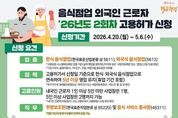 코리아타임뉴스 윤광희 기자 | 음식점업 외국인 근로자 '26년도 2회차 고용허가 신청 ■ 신청기간: 2026.4.20.(월)~5.6.(수) ■ 신청 요건 · 업종 한식 음식점업(한국표준산업분류 상 5611), 외국식 음식점업(5612) *고용보험 시스템에 등록된 업종 기준(실제 영업을 영위하는지 여부 등은 '사업자등록증' 또는 '영업신고증'으로 증빙) *기관구내식, 출장이동식, 기타간이, 주점, 비알코올 음료점은 미허용 · 업력 고용허가서 신청일 기준으로 한식·외국식 음식점업으로 연속하여 5년 이상 영업 유지(휴업 기간 포함) *부가가치세 과세표준증명원상 과세기간 또는 사업자등록증상 '개업년·월·일'로 확인 · 고용인원 내국인 근로자 1인 이상 5인 미만 사업장은 1명, 5인 이상 사업장은 2명까지 가능 *내국인근로자(피보험자) 수는 고용부에서 고용보험시스템 전산 확인 · 직무 주방보조원(한국표준직업분류 상 95220) 및 음식 서비스 종사원(45311) *현장 여건에 맞게 직무범위 탄력적 운영 가능 · 문의 - 고용노동부 상담센터 ☎1350 · 신청 - 사업장