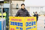 코리아타임뉴스 김택호 기자 | 강원특별자치도의회 문관현 기획행정위원장은 27일 여의도 국회 앞에서 ‘강원특별법 3차 개정안’의 조속한 처리를 촉구하며 릴레이 1인 시위에 나섰다. 개정안 통과를 위해 누구보다 앞장서 온 강원특별자치도의회의 상임위원장이 도민을 대신해 국회 앞에서 직접 행동에 나섰다는 점에서 큰 의미를 갖는다. 문 위원장은 국회 정문 앞에서 피켓을 들고 “강원특별법 3차 개정안은 강원의 미래를 여는 열쇠이자 300만 도민의 절박한 요구”라며,“도민의 명령을 받드는 도의회가 더는 침묵할 수 없다. 국회는 즉각 심사에 착수해야 한다”고 강하게 외쳤다. 그는 올해 내내 강원특별법 개정을 위해 중앙부처·국회·전문가 그룹과의 논의를 직접 챙기며 ‘책상에서만 말하는 정치가 아닌, 현장에서 답을 찾는 정치’를 강조해 왔다. 이번 1인 시위 역시 이러한 실천적 리더십의 연장선으로, 지역의 핵심 현안을 단순히 주장하는 데 그치지 않고 ‘몸으로 밀어붙이는 추진력’을 보여준 셈이다. 특히 “강원특별자치도가 실질적인 권한을 갖고 미래 전략을 스스로 주도하기 위해서는 3차 개정이 필수”라며, “정