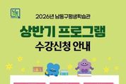 코리아타임뉴스 이아름 기자 | 인천시 남동구 평생학습관은 구민의 자기 계발과 지적 성장을 위해 오는 24일부터 ‘2026년 상반기 평생학습 프로그램’ 학습자를 모집한다고 20일 전했다. 상반기 프로그램은 3~5월까지 운영되며, 일상의 활력을 더하고 실질적인 역량을 강화할 수 있는 실용적인 강좌들로 꾸려졌다. 특히, ‘2025년 평생교육 강사학교’ 과정을 이수한 강사들이 지역사회와 시민의 삶을 주제로 직접 기획⋅개발한 강좌들이 다수 개설됐다. 주요 강좌로는 ▲남동구의 색(色)다른 이야기 ▲나의 감정을 안아주는 예술이야기 ▲생성형 AI로 만드는 나의 영상 콘텐츠 ▲그림책과 공예 테라피로 나를 찾는 ‘다시, 봄’ 등 모두 4개 과정이 운영된다. 이와 함께 전 연령층의 학습 수요를 반영한 다양한 강좌도 운영된다. ▲시니어(65+) 스마트폰 입문 클래스 ▲바리스타 2급 자격과정 ▲오뒷세우스 깊게 읽기 ▲장애인과 비장애인이 함께하는 생태탐방 등 실용성과 인문적 소양을 아우르는 프로그램이 준비돼 있다. 수강 신청은 남동구평생학습관 홈페이지에서 선착순으로 진행되며, 남동구민 또는 남동구