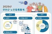 코리아타임뉴스 노승선 기자 | 전남 무안군은 노인 복지 정책 수립의 기초자료로 활용하기 위해 ‘2025년 무안군 노인등록통계’를 신규 작성하여 그 결과를 공표했다. 이번 통계는 ▲인구·가구 ▲경제 ▲ 일자리 ▲복지 ▲ 건강 등 5대 분야 총 59개 항목으로 구성됐으며, 무안군 각 실과, 국가데이터처, 한국고용정보원, 국민건강보험공단 등 관련 공공기관에서 생산한 행정자료와 기존 통계자료를 연계 및 분석하여 개발했다. 조사 대상은 2024년 12월 말 기준 무안군에 주민등록이 된 만 65세 이상 노인이다. 공표 결과, 2024년 말 기준 무안군 노인 인구는 18,398명으로 전체 인구 92,913명 가운데 19.8%를 차지한다. 이는 전국 평균(20%)과 비슷한 수준으로 초고령화 지역으로 진입했으며, 노인 관련 행정 수요가 지속적으로 확대되고 있음을 보여준다. 이번 공표된 무안군 노인등록통계는 무안군 홈페이지 ‘행정공개 → 군정자료 → 노인등록통계’에서 군민 누구나 확인할 수 있다. 이광진 기획실장은 “노인등록통계는 노인의 삶의 질 향상을 위한 각종 정책 수립의 기초자료로 활용