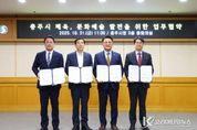 코리아타임뉴스 박찬식 기자 | 충주시는 31일 시청 중회의실에서 2027년 하계세계대학경기대회의 성공적인 개최와 문화예술 발전을 위해 국립한국교통대학교, 건국대학교 글로컬캠퍼스, 충주시체육회와 공식 업무협약을 체결했다. 이번 협약은 지역 주요 체육관과 충주문화회관의 리모델링 공사로 경기장과 문화시설 활용이 일시적으로 제한됨에 따라, 지역 대학교 시설을 비롯한 각종 지원 협력을 공식화하기 위해 마련됐다. 협약식에는 조길형 충주시장, 윤승조 국립한국교통대학교 총장, 최영근 건국대학교 글로컬캠퍼스 부총장, 진용섭 충주시체육회장 등이 참석해 전문체육 및 생활체육 활성화, 문화예술 발전 등을 위한 협력 강화, 협약 기관 간 인적 인프라 지원 등 다양한 분야에서 협력하기로 뜻을 모았다. 협약을 통해 각 기관의 체육관 등 시설 대관 시 적극적인 협조를 받고, 주요 행사 진행 시 기관 간 자원봉사 등 인프라 지원이 이뤄질 것으로 기대된다. 조길형 시장은 “2027년 U대회 성공 개최와 문화예술 발전을 위해 모두가 한 데 힘을 모으는 좋은 계기가 마련됐다”라며, “이번 U대회는 대학생들과 지역사회 모두가 어우러져
