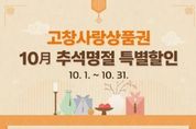 코리아타임뉴스 윤경수 기자 | 고창군이 추석을 맞아 군민 생활안정과 지역경제 활성화를 위해 ‘고창사랑상품권 특별할인 행사’를 진행한다. 이번 행사는 10월 한 달간 진행된다. 이번 특별할인은 △상품권 구매시 10% 선할인 △고창사랑카드 결제시 10% 캐시백 적립을 통해 최대 20% 혜택을 받을 수 있도록 구성됐다. 특히, 월 구매한도를 100만 원까지 확대해 군민들의 혜택을 더욱 강화했다. 예를 들어, 10만원 상품권 구매 시 10%(1만 원) 선할인을 적용받아 9만원에 구매하고, 이후 고창사랑카드로 결제하면 결제금액의 10%가 캐시백으로 적립돼 실질적으로 최대 20% 혜택을 누릴 수 있다. 다만, 선할인(10%)이 적용된 금액은 캐시백 적립 대상에서 제외된다. 심덕섭 고창군수는 “이번 추석 명절 특별 할인을 통해 군민들께는 생활비 부담을 덜어드리고, 지역 소상공인들에게는 매출 증대 효과가 기대된다”며 “특히, 군에서 지급하는 군민활력지원금과 정부의 민생소비쿠폰이 더해져 군민 모두가 더욱 넉넉한 추석 명절을 보내시길 바란다”고 밝혔다. 한편, 고창사랑상품권은 전통시장과 지역
