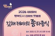 코리아타임뉴스 오영주 기자 | 김해시는 ‘2025 김해 제야의 종 타종식’을 오는 31일 오후 10시40분부터 2026년 1월 1일 0시 30분까지 김해시민의 종 일원에서 개최한다고 26일 밝혔다. 기존 의례 중심의 타종에서 벗어나 시민 참여와 지역성을 핵심 가치로 한 체험형·참여형 새해맞이 행사로 새롭게 구성한 것이 특징이다. 특히 타종인사 상당수를 공모로 선정한 30명의 시민대표로 구성해 새해의 첫 울림을 시민 스스로 만들어 가는 의미 있는 행사로 마련했다. 시민들은 타종뿐 아니라 시민 송년사 영상, 새해소망 메시지 참여 등으로 행사 전반에 직접 참여한다. 공연 프로그램도 김해의 정체성을 살린 지역 예술인 중심 무대로 꾸며진다. 우리소리예술단의 전통공연을 시작으로 전자바이올린, 혼성그룹 공연이 어우러진 제야음악회를 비롯해 시립합창단의 수준 높은 공연과 농악 피날레 공연으로 새해의 흥을 더할 예정이다. 또 공연장 곳곳에서 남녀노소 누구나 즐길 수 있는 체험형 부대행사가 운영된다. 새해 소망을 적어 거는 소망지, 1년 뒤 전달되는 느린 우체통, 전통놀이 체험존,