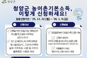 코리아타임뉴스 김택호 기자 | 청양군이 오는 22일부터 내년 1월 30일까지 ‘농어촌 기본소득 시범사업’ 신청을 받는다고 밝혔다. ‘농어촌 기본소득 시범사업’은 농어촌 지역 주민의 기본 생활 안정을 돕고 지역경제 선순환 구조를 만드는 것을 목표로 대상 주민에게 월 15만 원을 지역사랑상품권(모바일·체크카드) 형태로 지급한다. 신청 대상은 청양군에 주민등록을 두고 실제 거주하는 주민이며, 12월 22일부터 본인이 주소지 관할 읍‧면사무소 총무팀을 방문해 신청할 수 있다. 신청 시에는 반드시 신분증을 지참해야 하며 미성년자나 피후견인은 대리 신청할 수 있다. 대리 신청 시에는 대리인 신분증과 가족관계증명서 등 관계를 확인할 수 있는 서류도 함께 제출해야 한다. 또한 신규 거주자(10월 20일 이후 전입자)의 경우 매매·임대차계약서, 거주 증빙사진, 공과금 영수증 등 거주 사실을 확인할 수 있는 서류를 추가로 제출해야 한다. 외국인은 주민등록등본 또는 외국인등록증, 영주권·난민인정 증명서 등을, 재외국민은 국내거소사실증명서를 제출해야 한다. 수령을 위해서는 지역사랑상품권 앱 설치 및 체크카드 발급이 필요
