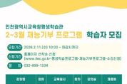 코리아타임뉴스 사회팀 | 인천광역시교육청평생학습관은 오는 23일부터 ‘재능기부 프로그램’을 운영한다. 이번 프로그램은 시민이 강사로 참여해 자신의 전문성과 경험을 공유하는 참여형 평생학습 활동으로, 매월 새로운 주제의 강좌를 통해 생활 속 배움의 기회를 제공한다. 2월부터 운영되는 강좌는 ‘시니어 요가’, ‘시니어 필라테스’, ‘근력 스트레칭’, ‘나를 닮은 꽃그림’, ‘내 마음속의 논어’ 등 총 5가지이다. 수강 신청은 11일 오전 10시부터 평생학습관 누리집에서 선착순으로 진행되며, 자세한 사항은 누리집의 공지사항을 확인하거나 평생교육부로 문의하면 된다.