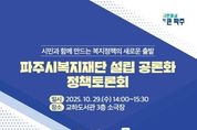 코리아타임뉴스 윤광희 기자 | 파주시는 오는 29일 14시, 교하도서관 3층 소극장에서 ‘파주시복지재단 설립 공론화 정책토론회’를 개최한다고 밝혔다. 이번 토론회는 파주시복지재단 설립을 앞두고 시민, 전문가, 현장 종사자의 다양한 의견을 수렴해 재단 설립의 필요성과 발전 방향을 함께 모색하기 위해 마련됐다. 토론회는 김민철 서영대학교 사회복지행정학과 교수의 기조 강연을 시작으로, 파주시 복지기획팀장의 주제 발표가 이어진다. 이어 한지원 두원공과대학교 교수가 좌장을 맡아 토론을 진행하며, 이보경 파주시문산종합사회복지관 관장, 오민수 경기복지재단 선임연구위원, 박윤근 화성시복지재단 사업본부장 등이 참석해 열띤 논의를 펼칠 예정이다. 토론에서는 ▲파주시복지재단 설립의 필요성과 추진 개요 ▲파주시 여건을 반영한 복지재단의 발전 방향 ▲재정 자립 및 지속가능성 확보 방안 등 다양한 주제가 심도 있게 논의될 예정이다. 김은숙 복지정책국장은 “파주시복지재단은 시민의 삶을 보다 세밀하게 지원하고, 지역 현장의 목소리를 반영한 ‘파주형 복지모델’을 실행할 구심점이 될 것”이라며, “이번 토론회를 통해 파주시 복지